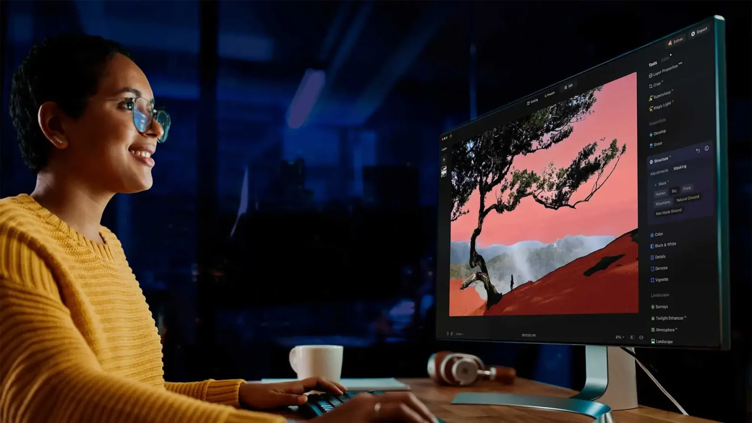 Luminar is ideal for users looking for quick, artistic results with intuitive AI functions and atmospheric effects.